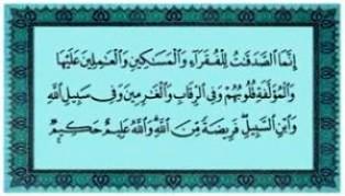 {إِنَّمَا الصَّدَقَاتُ لِلْفُقَرَاءِ وَالَمَسَاكِينِ وَالْعَامِلِينَ عَلَيْهَا وَالْمُؤَلَّفَةِ قُلُوبُهُمْ وَفِي الرِّقَابِ وَالْغَارِمِينَ وَفِي سَبِيلِ اللَّهِ وَابْنِ السَّبِيلِ فَرِيضَةً مِّنَ اللَّهِ وَاللَّهُ عَلِيمٌ حَكِيمٌ} (سورة التوبة، الآية 60).